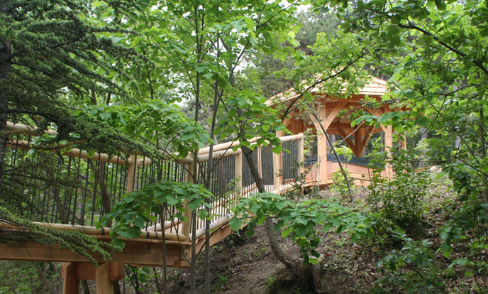 La Cabane d'Eglantine se sentait un peu seule perchée sur son vieux chêne... Cette année, la cabane de Léna s’est octroyé une place de choix à quelques mètres de sa cousine. Elle ne manque pas d’arguments avec ses 2 étages, sont confort sans pareil, et sa passerelle qui mène à sont jacuzzi.